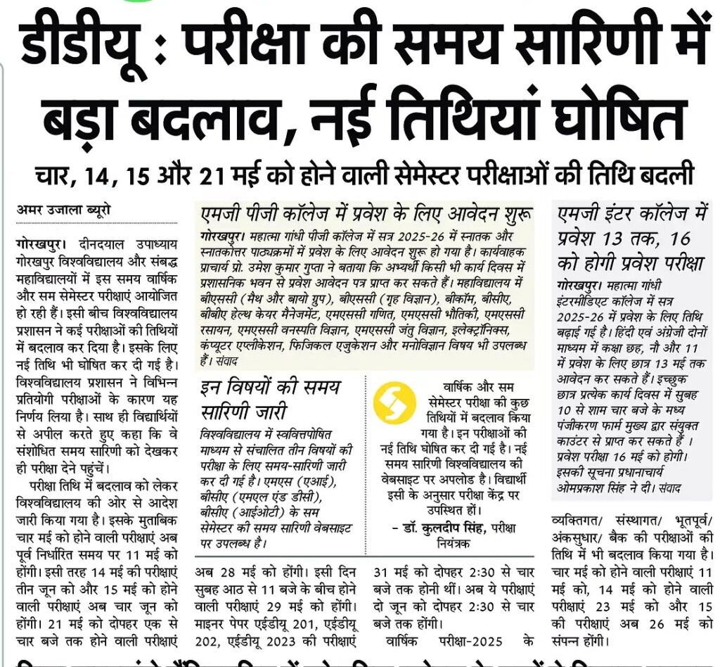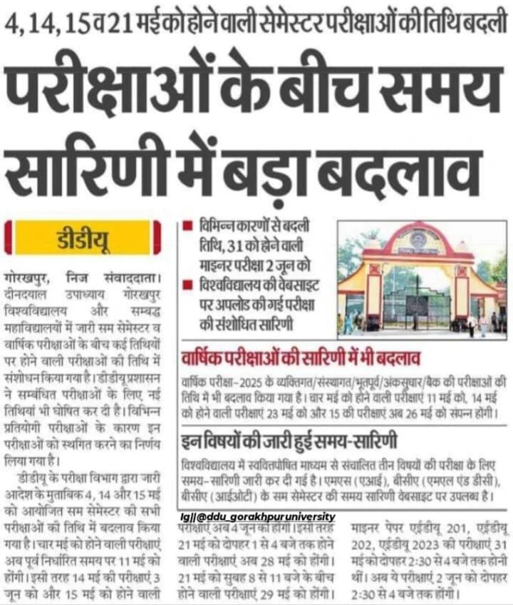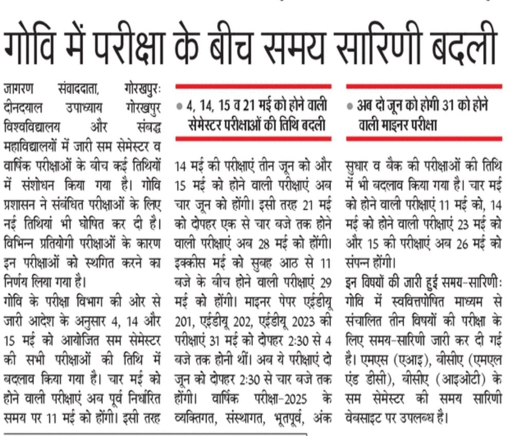 न्यूज़ डेस्क: गोरखपुर विश्वविद्यालय का टाइम टेबल एक बार फिर बदल गया है। 4,14,15 और 21मैं को होने वाली परीक्षाओं में बदलाव किया गया है। 4 मई को होने वाली परीक्षा अब 11मई को होगी। जबकि 14, 15 और 21 मई की परीक्षायें क्रमशः 3 जून, 4 जून और 28 मई को होगी।